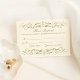 Decorative swirls and flourishes frame this elegant vintage inspired wedding response card design that is worded for two guest names. Ivory background with antique gold design. Personalise the custom RSVP text with your reply due date.