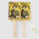 This hand fan is illustrated with a decorative vintage Japanese geisha and demon. It has an aged antique oriental feel and is with a bamboo design in the back ground.