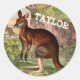 Vintage kangaroo colour illustration with your name or other text (delete if unneeded). A kangaroo frolics in the foreground with others hopping behind. Antique children's book illustration in soft colours.