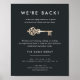 Announce your business reopening to the community with this modern and elegant poster that's perfect for real estate brokerages, realtors, and property management companies. Modern design features white lettering on a soft black background adorned with a vintage style skeleton key illustration in faux gold foil. Personalize with five template text fields for your headline, body text, company name, and contact information.