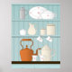 A vintage style kitchen illustration of a copper kettle, coffee pot (or tea pot), sugar bowl, jug, flour/sugar storage containers, dinner service; bowl, plate and cups, and an icing sugar sprinkler on a kitchen French dresser.