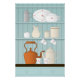 A vintage style kitchen illustration of a copper kettle, coffee pot (or tea pot), sugar bowl, jug, flour/sugar storage containers, dinner service; bowl, plate and cups, and an icing sugar sprinkler on a kitchen French dresser.