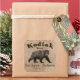 The left half of label from a can of mythical Kodiak Brand Sockeye Salmon circa 1879. The monochrome (brown) image features a Kodiak Bear (Ursus arctos middendorffi). Text reading "Kodiak Brand Sockeye Salmon" and "Contents About One Pound" also appears. It is rare to find a label this old in such good condition.