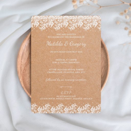 Part of a coordinating collection, our Vintage Kraft Floral Lace Envelopes complement your entire wedding suite effortlessly. Make a statement of sophistication and nostalgia with this refined accessory. Enhance your special day with this exquisite blend of vintage charm and contemporary flair.