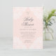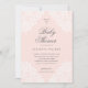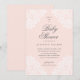 An elegant baby shower invitation featuring soft white lace corners on a blush pink background.