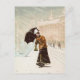 A smartly dresses woman is walking in the streets of a city .She is holding an umbrella to protect herself from the snow .Blurred image of other people can be seen in the background in front of a townhouse . The graphic image is courtesy of the National Library of Norway .(Nasjonalbiblioteket) .Date: ca 1900 .