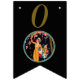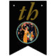 This flag shaped bunting Happy Birthday banner is black with golden letters and a vintage lady in a yellow dress holding a flowered box picking pretty pink cherry blossom flowers from a tree inside a gold and blue circle. Customise the birthday year with the templates.