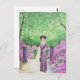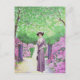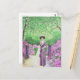 A custom postcard that features an elegant vintage lady in a garden of rhododendrons.