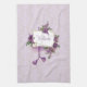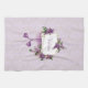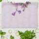 Sprays of romantic lilacs surround a centre white scroll with purple cords and tassels on a soft pastel lavender damask background.
