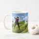 Vintage looking golfer in early 20th century attire taking a swing of his golf club on a watercolour landcaspe . Ideal gift for the golf fanatic or golfer in your life