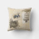 COLOR PALETTE: cream, tan, blue and brown. DESIGN COLLECTION: Decorative throw pillows for home decor. Custom design was created for housewarming, wedding or anniversary gifts as it is personalised with your family name and the year your family was established. Decorate with "Vintage Love Birds" a collection designed by Audrey Jeanne Roberts using new watercolors, elegant antique hand painted blue birds, a Victorian era bird cage, a soft damask style pattern in the background, music notes and old etched baroque printers ornament illustrations. The reverse side repeats many of the same elements in a coordinating pattern. The artwork has been transformed into a vintage looking postage stamp that's very fun. This is a very modern, trendy Vintage Style design with a romantic touch.