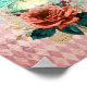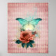 Beautiful digital art collage poster print features "glowing" teal and ivory luna moth with vintage floral bouquet on distressed pink harlequin pattern background