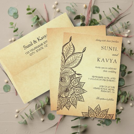 Traditional wedding envelope featuring an elegant henna art against a vintage parchment background. Customise it with your name and address on the back flap.