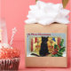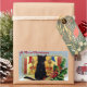 Vintage Merry Christmas greeting holiday stickers for cat lovers- Cute vintage Christmas design reads 'A Merry Christmas' in red, vintage style calligraphy in the upper corner. Displays a black kitten staring at the Christmas fireplace with a roaring fire and hanging, old-fashioned Christmas stockings. In the foreground is classic holiday holly berries and leaves. Beautiful Christmas greeting labels for personalising Christmas envelopes and shipping holiday gifts. Animal lovers will adore these vintage cat holiday stickers. We have many more vintage Christmas stickers in our Zazzle.com/angela65 shop.