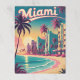 A vibrant, vintage 1980s-style travel poster captures a colourful sunset over Miami Beach, featuring prominent palm trees and Art Deco buildings along the shoreline, with "Miami" in a stylish script at the top.