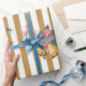 Bring timeless holiday cheer to your gifts with this vintage-style mistle toe bells and gold striped wrapping paper. This classic festive design captures the magic of Christmas. Perfect for wrapping family gifts, holiday parties, and seasonal celebrations, this charming gift wrap adds warmth and nostalgia under every tre