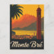 This vintage-style travel poster captures the scenic beauty of Monte Bré, overlooking the stunning Lake Lugano in Switzerland. The design features a bold, graphic illustration of a church bell tower in the foreground, with the lush landscape of the mountain and the picturesque lakeside village below. The rich, warm colour palette evokes a classic, retro feel reminiscent of mid-century travel art.