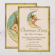 Vintage angel on an crescent moon and a gold trimmed border holiday invitation.