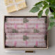 A vintage style design of moths over a pattern of pink stripes.