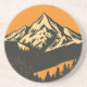 A vintage-inspired design featuring a majestic mountain peak bathed in the warm glow of a setting sun. The mountain is surrounded by a dense forest of pine trees, creating a peaceful and serene atmosphere.