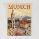 Experience the charm of Germany with this classic postcard of Munich! It features Marienplatz with the New Town Hall and the stunning alpine backdrop. The faded warm colours and subtle grain enhance its vintage graphic style, with a bold "Munich" typeface in a 1960s style.