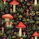 Whimsical mushroom illustrations with ferns, moss, and wildflowers