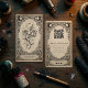 The design features a detailed mystical illustration of a tattoo machine and rose framed by ornate tarot-inspired details, creating a unique celestial aesthetic that stands out from traditional tattoo studio branding.