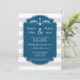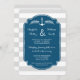 Custom template engagement party invitations with wide vintage light grey and white stripes pattern, rustic navy blue frame, and nautical details. Fully customisable with your engagement party details. Also available in a wide range of matching wedding products.