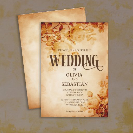 Elegant vintage wedding design featuring antique aged tea stain parchment with etched Rose twig and stylish wedding invitation text. You can add your own details very easily by using the template field.
