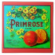 Vintage Primrose orange company ceramic tile. In vibrant and cheery colours of orange, yellow, turquoise and green. Features oranges, flowers and says "Primrose".