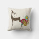 A gorgeous Christmas holiday throw pillow features a brown deer and lots of brightly coloured vintage style ornaments on an alabaster white background.