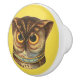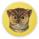 Features the face of a seemingly disgruntled owl in brown, yellow, black and blue. Derived from a vintage mustard label.