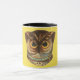 Features the face of a seemingly disgruntled owl in brown, yellow, black and blue. Derived from a vintage mustard label.