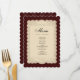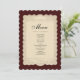 Complete your wedding table setting with this elegant vintage-inspired wedding menu card. Featuring a romantic lace-style frame, rich burgundy tones, and classic typography, this menu design adds timeless charm to your reception décor. Perfect for formal, vintage, or romantic weddings, this menu card is fully customizable with your names and menu details, creating a refined and cohesive look for your celebration.