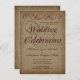Rustic Country Distressed Brown Wedding Invitations with the words "Wedding Celebration" in large fancy script font. The "Wedding Celebration" wording cannot be changed. (contact me if you need a different colour). The brown background has the distressed look of old antique vintage paper with a few flourish scroll swirls designs at the top. The background has the appearance of a burlap print, but it is a flat printed invitation. Choose from square or rounded corners. These country style wedding announcements are great for barn weddings, country weddings, and anyone looking for an elegant rustic invite.