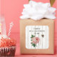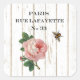 Shabby chic stickers feature a vintage paris address sign, vintage pink rose and hovering honey bee on a distressed wood background.