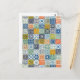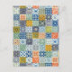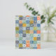 This postcard features a patchwork panel of vintage furnishing fabric that looks like a quilt.
