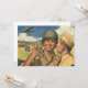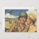 Vintage illustration patriotism American military image featuring two happy proud men on base and an aeroplane flying overhead in a clear sky. One man is wearing a helmet for safety.