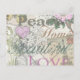 A beautiful collage of old-fashioned bits of illustrations and lovely words, this vintage montage is all about peace, home, beauty, and love. The collage has girly floral elements, vintage postcards, and old lattice and scroll work. The collage is a pretty ornate pattern that is perfect for chic home decoration; a unique collage of typography mixed with vintage antiques to create a feminine designer style.