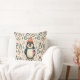 A Christmas throw pillow with cute whimsical penguins candy canes and pine trees in brick red, gold and turquoise.