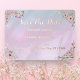 Announce your special day with the Vintage Periwinkle Pink Peony Real Foil Save the Date, featuring watercolor roses and peonies on a dreamy pink and blue background. Your choice of luxurious rose gold , gold or silver foil adds a touch of vintage charm. This save the date card is perfect for a spring or summer garden wedding and is part of a full real foil wedding collection, including invitations, menus, programs, and more, ensuring your wedding stationery is beautifully coordinated.
