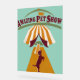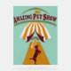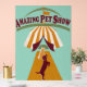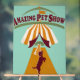 A retro circus poster style with a dog and cat performing tricks, featuring " Amazing Pet Show" in vintage typography.