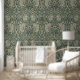 Enhance your home with the timeless elegance of this vintage wallpaper, inspired by the exquisite designs of William Morris. The intricate pattern features majestic pimpernel flowers and delicate blossoms intertwined with lush green leaves and vines, set against a rich, deep teal background. This sophisticated design showcases a harmonious blend of soft pastel greens, pale yellows, and muted gold tones, bringing a touch of classic sophistication and natural beauty to any room. Perfect for creating a serene and elegant atmosphere, this wallpaper seamlessly combines traditional charm with contemporary style.