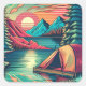 Camping themed stickers. The graphics are of a pink and teal vintage campsite scene with a tent, sunset, lake and pine trees.