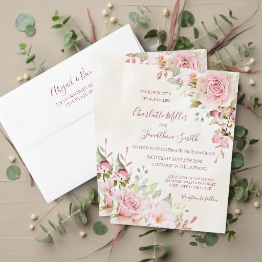 An elegant custom napkin for your spring or summer wedding table with lovely vintage blush pink watercolor roses and flowers, pastel greenery and rose gold touches.