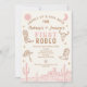 Sweet brown and pink twin girl's first rodeo birthday invitation featuring a pink desert landscape, cowgirl boots and hat, skull, moon and sun. This western saddle up and ride over first birthday invitation for twin girls is ideal for a southwest country or wild west themed first birthday party.