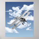 Vintage aviation art design of a historical biplane flying through the cloudy sky.
