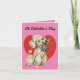 Sweet, vintage picture of a poodle holding a rose in it's mouth with a big, red heart in the background, is featured on this Valentine's Day card. Front of card reads, "On Valentine's Day" and inside of card reads, "Woof you be Mine?". A cute card for Valentine's Day giving!