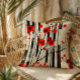This dynamic retro floral design features bright red poppy flowers on an abstract cream and black background.