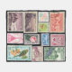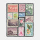 Discover your inner wanderlust with this nostalgic design adorned with vintage postage stamps from across the globe. Modern black background and colourful pastel florals birds and architecture.